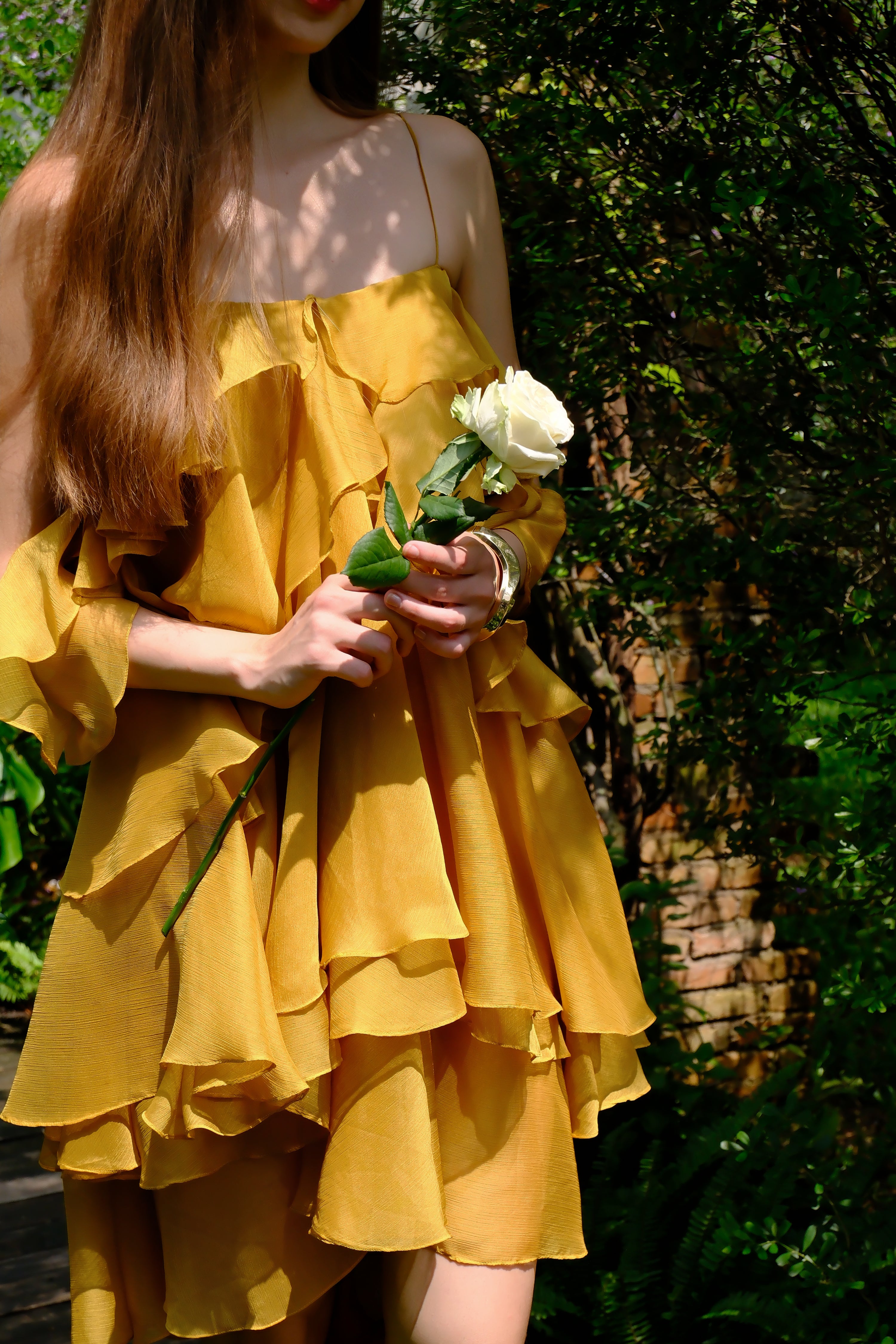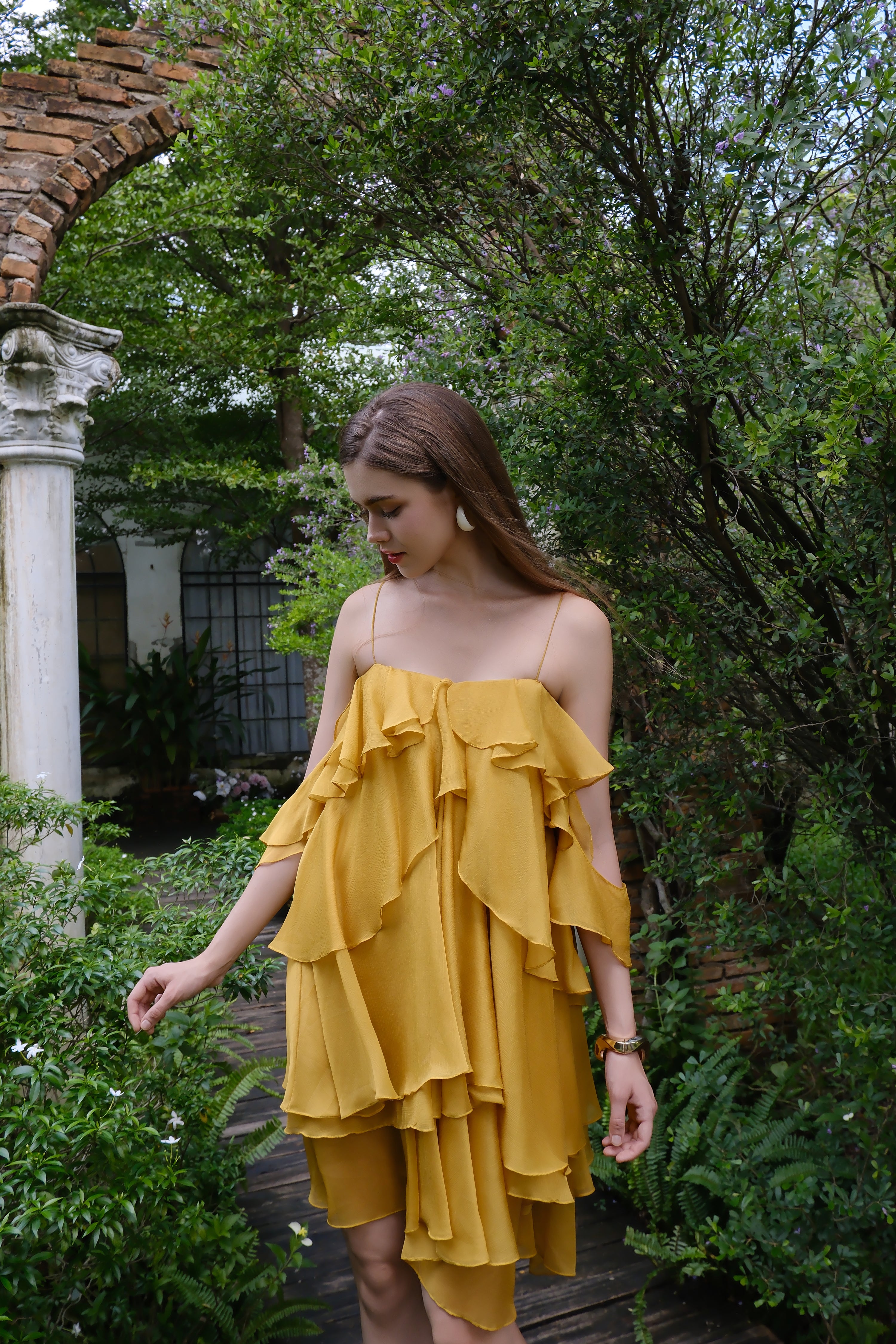 Vietnamese below / Mô tả Tiếng Việt phía dưới The Lilia Dress is a charming short-tiered dress in a warm turmeric yellow hue, designed to brighten your wardrobe with effortless femininity. Crafted from lightweight, breathable chiffon, this piece feels airy and comfortable, making it perfect for warm days and sunny escapes....
